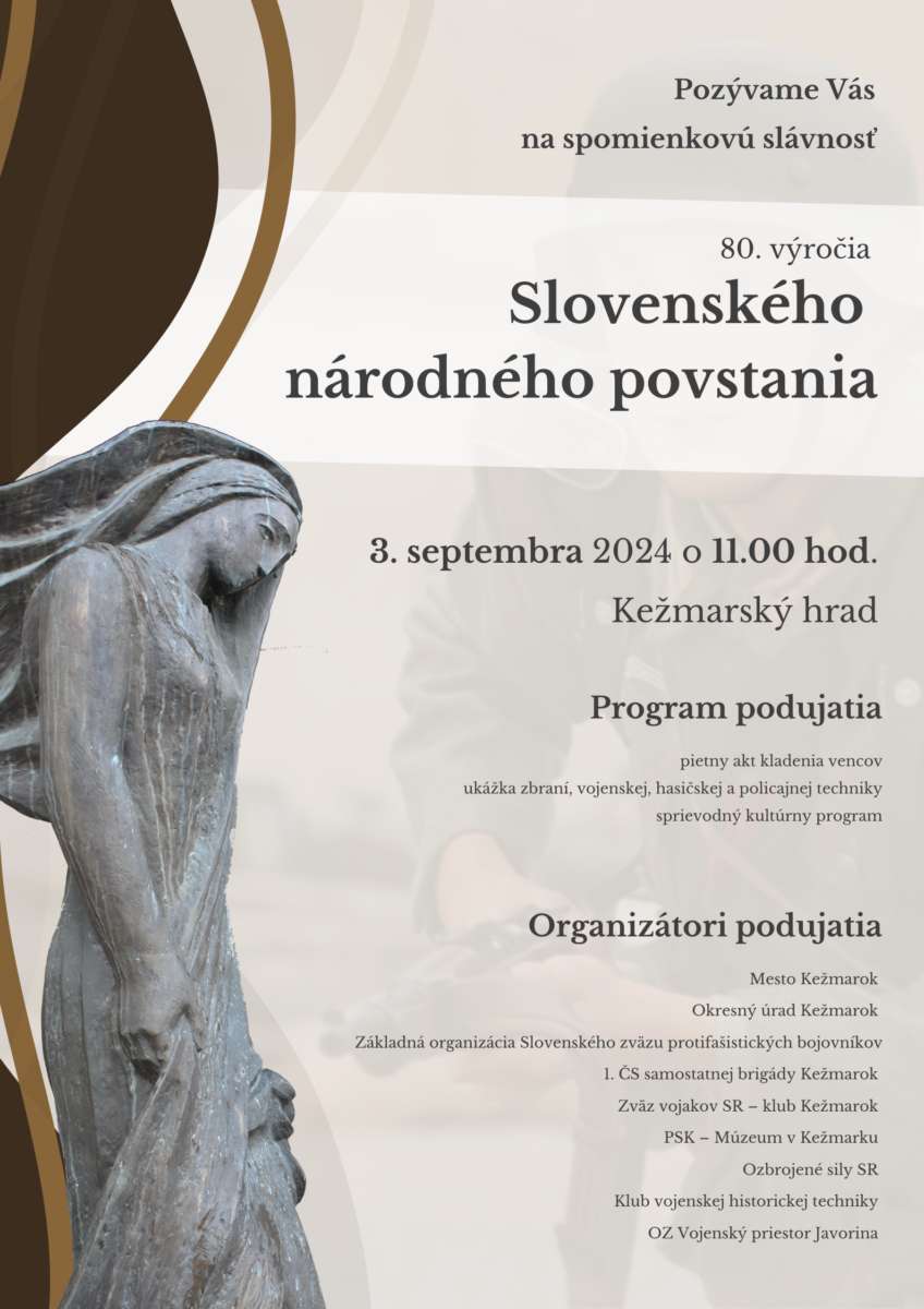 Múzeum v Kežmarku pozýva v utorok 3. septembra 2024 o 11:00 na spomienkovú slávnosť, ktorá sa uskutoční na Kežmarskom hrade pri príležitosti 80. výročia Slovenského národného povstania.