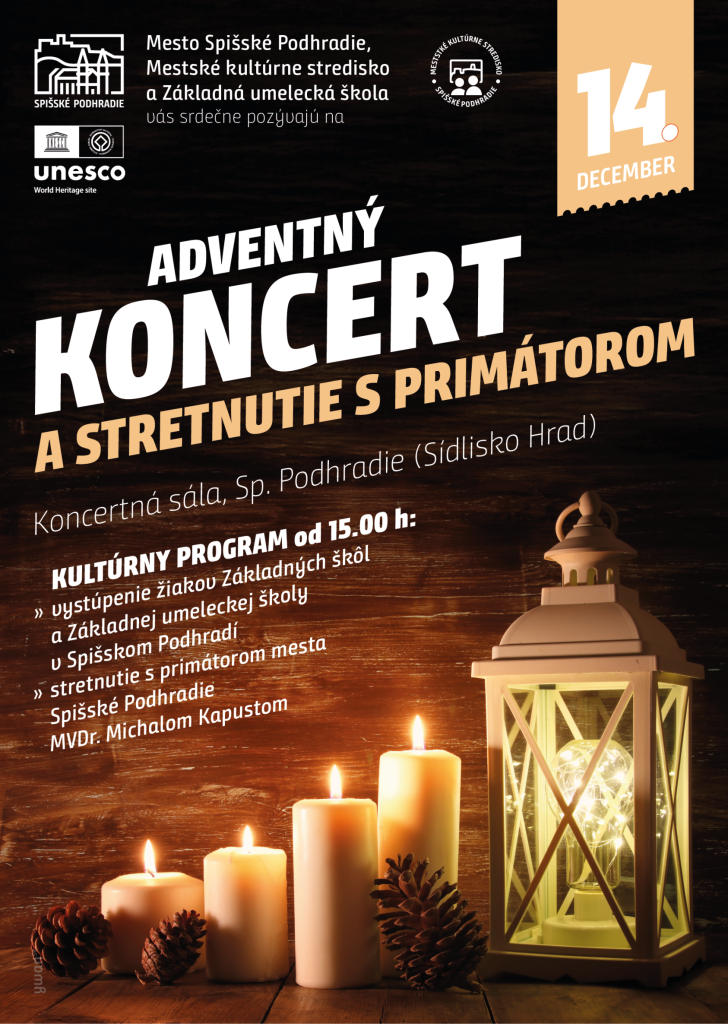 Mesto Spišské Podhradie srdečne pozýva na podujatie „ADVENTNÝ KONCERT A STRETNUTIE S PRIMÁTOROM„, ktoré sa uskutoční v sobotu 14. decembra 2024 v Koncertnej sále v Spišskom Podhradí.