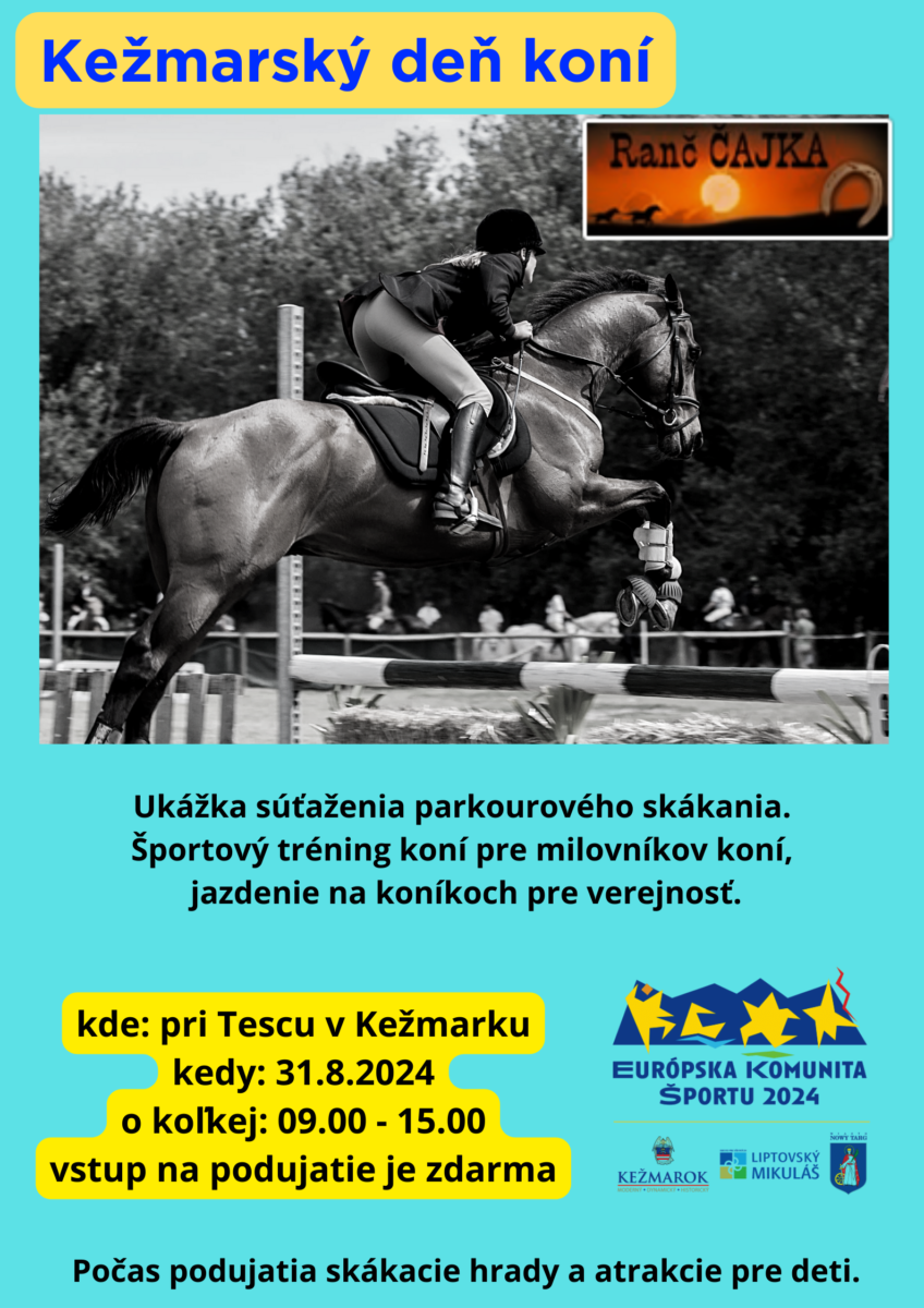 V sobotu 31. augusta 2024 sa v čase od 09.00 hod. do 15.00 hod. uskutoční Kežmarský deň koní, ktorý bude zahŕňať ukážku súťaže v parkourovom skákaní, športového tréningu koní a samozrejme bude možnosť vyskúšať si jazdu na koni aj pre širokú verejnosť.