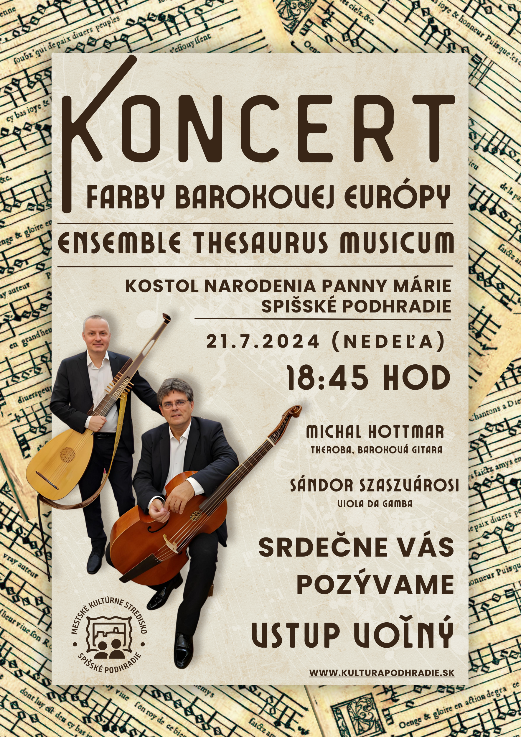 AktualityKoncert Farby barokovej Európy Mesto Spišské Podhradie srdečne pozýva na koncert starej hudby „Farby barokovej Európy“, ktorý sa uskutoční v nedeľu 21. júla 2024 o 18:45 hod. v Kostole Narodenia Panny Márie v Spišskom Podhradí.