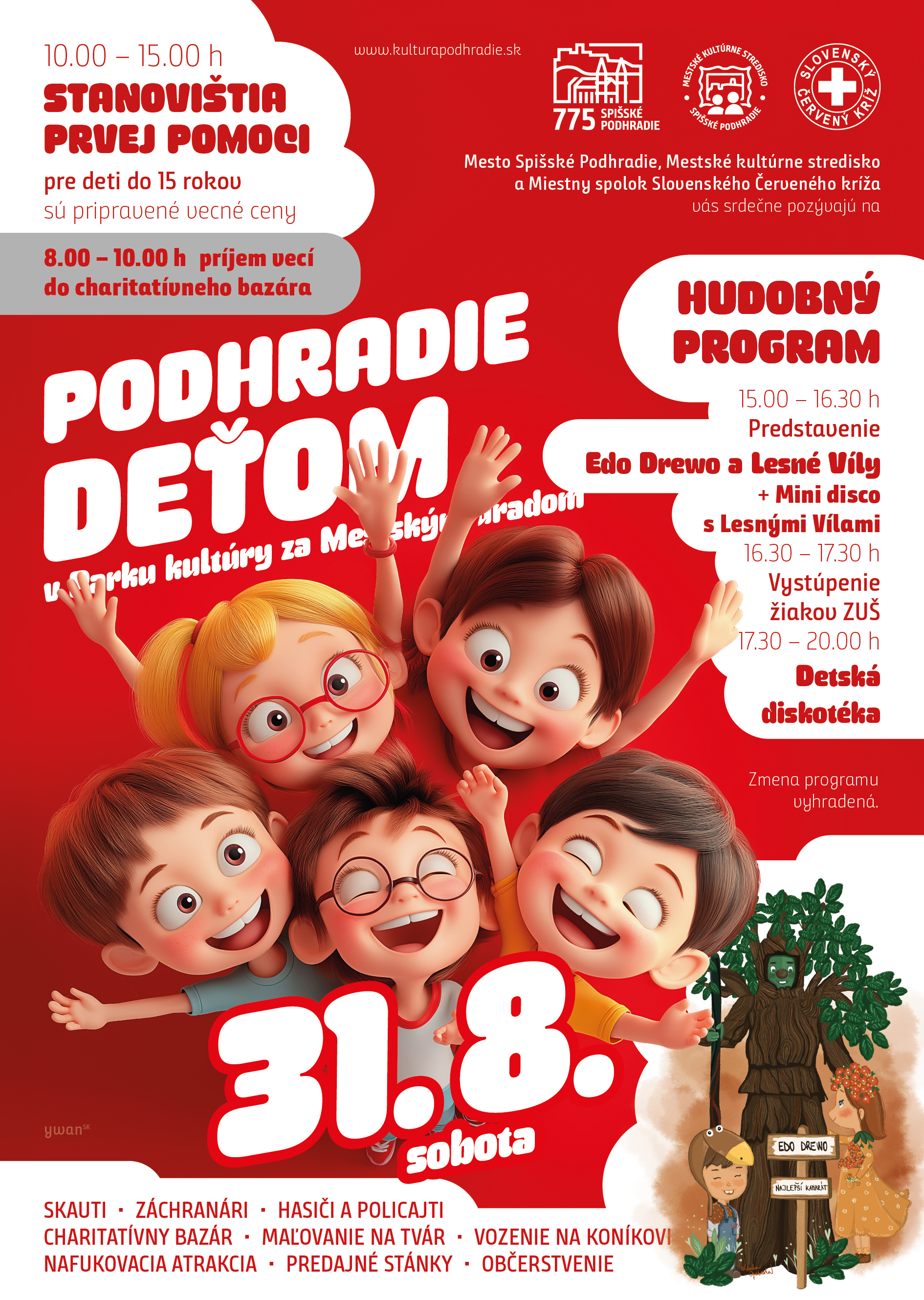 Mesto Spišské Podhradie srdečne pozýva na podujatie „PODHRADIE DEŤOM„, ktoré sa uskutoční v sobotu 31.8.2024 v Parku kultúry v Spišskom Podhradí.
