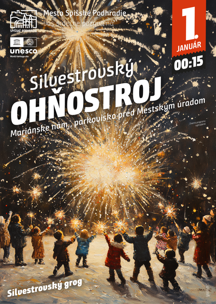 Mesto Spišské Podhradie aj tento rok srdečne pozýva na „Silvestrovský ohňostroj„, ktorý sa uskutoční 01.01.2025 o 00:15 hod. na Mariánskom námestí pred Mestským úradom v Spišskom Podhradí.