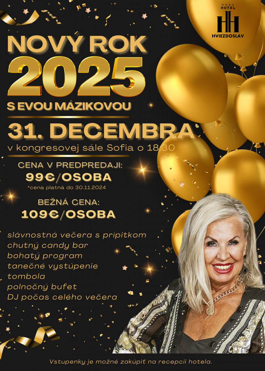 Na Silvestra bude v Boutique Hoteli Hviezdoslav v Kežmarku veselo s hlavnou hviezdou večera, Evou Mázikovou. O tanečnú zábavu sa postará DJ a atmosféru obohatia tanečné vystúpenia. Bohatý program bude doplnený o tombolu. Hladní určite neostanete, bude pre vás pripravená slávnostná večera s prípitkom, chutný candy bar aj polnočný bufet.