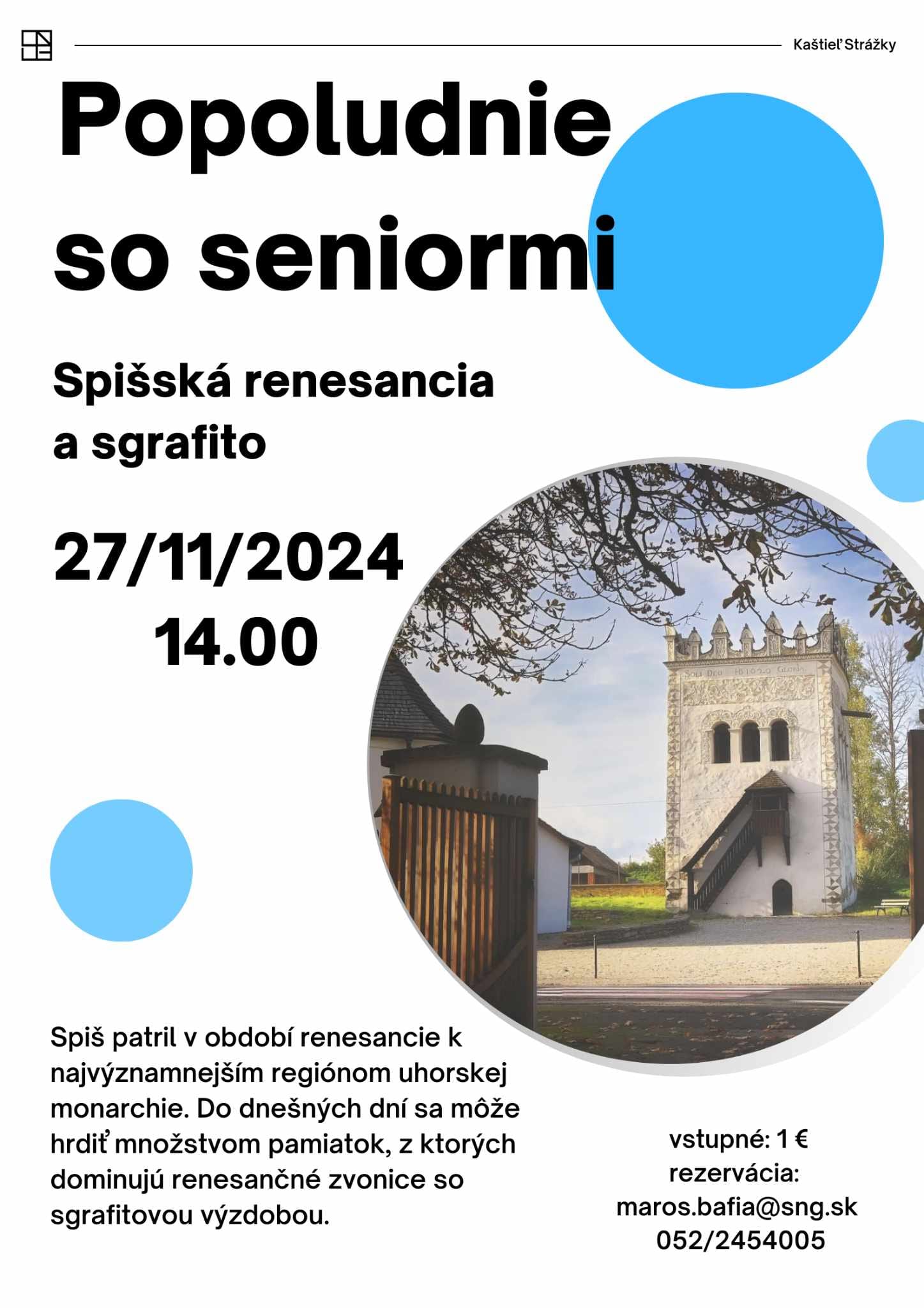 SNG Kaštieľ Strážky pozýva v stredu 27. novembra o 14.00 hod. na novembrové popoludňajšie stretnutie so seniormi, porozprávať sa o krásnom regióne pod Tatrami.