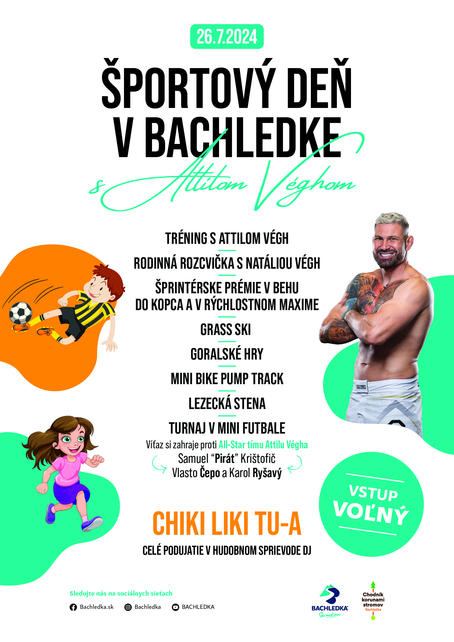 Horské stredisko Bachledka SKI & SUN vás srdečne pozýva na jedinečné podujatie „Športový deň v Bachledke s Attilom Véghom„, ktoré sa uskutoční 26.7.2024 priamo pod Chodníkom korunami stromov. Počas tohto dňa plného zábavy, športových výziev a nezabudnuteľných zážitkov pre veľkých i malých sme si pre Vás pripravili bohatý program, ktorý poteší návštevníkov všetkých vekových kategórií.